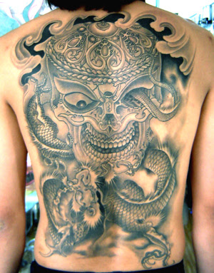 DownloadThis tattoo artist likes to put skull and Chinese dragon together - a weird combination.
